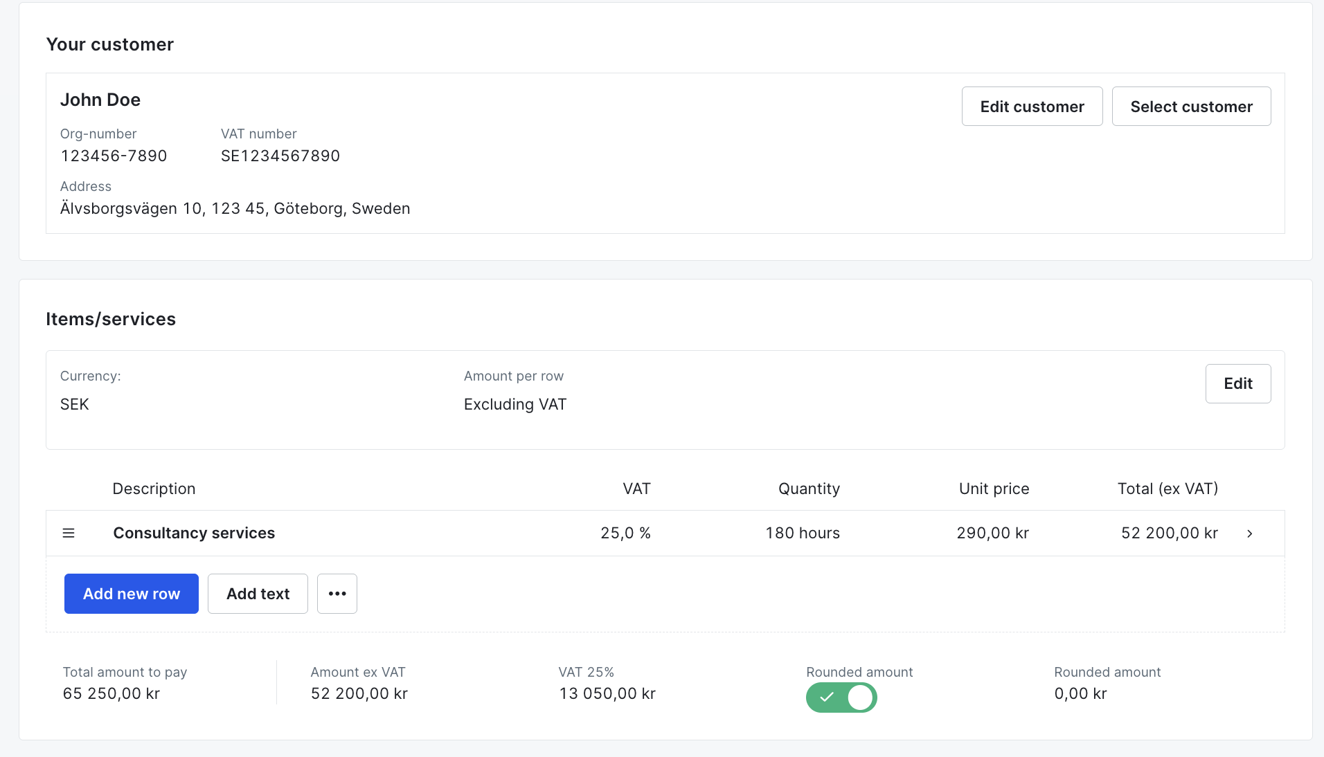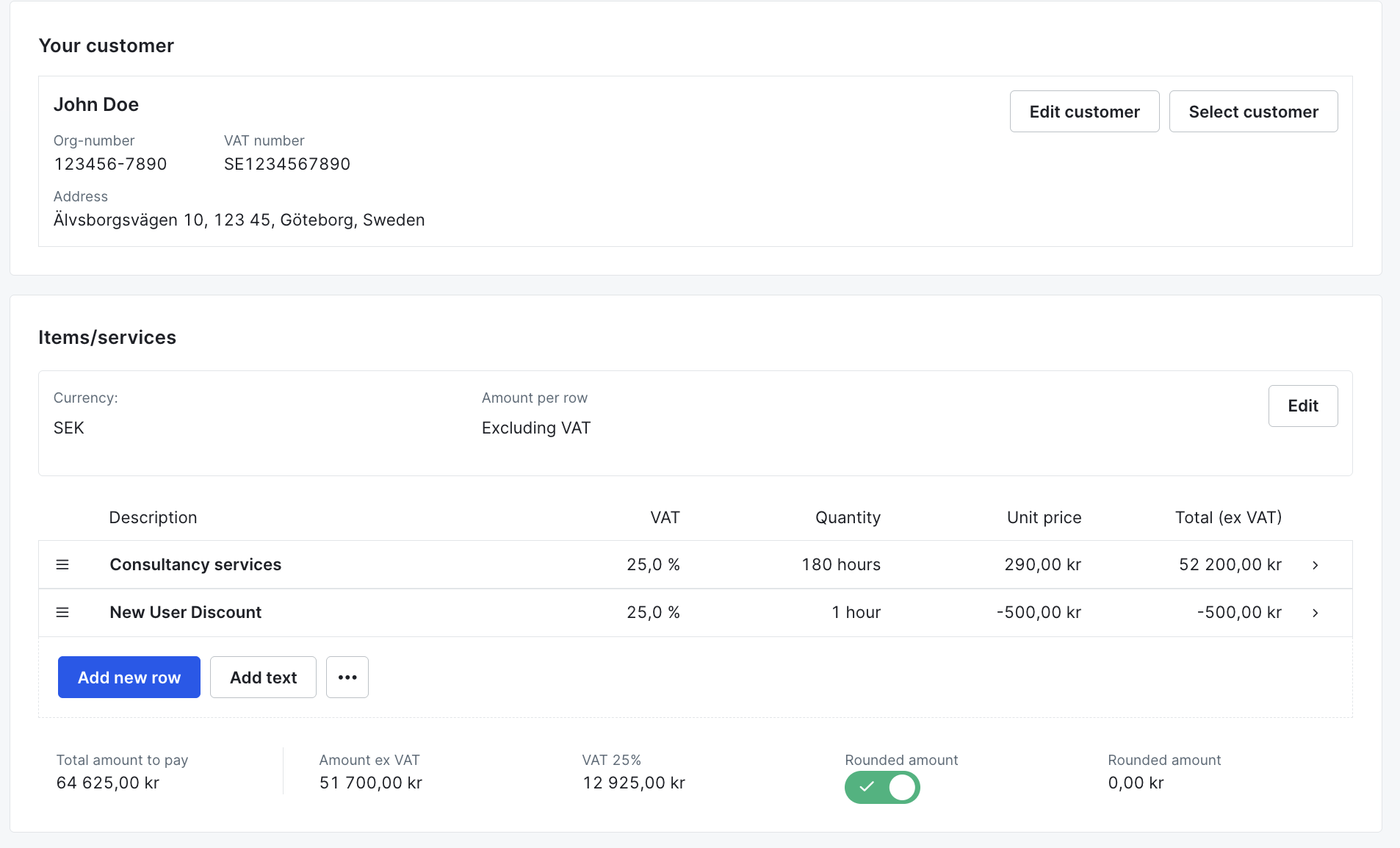 Bokio does not currently support per-item discounts directly. To apply a discount, add a new line item with a negative unit price.