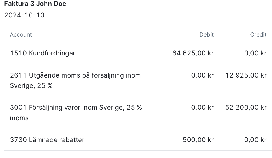 }This negative line represents a discount of 500 SEK. The account 3730 is commonly used for discounts but can be adjusted according to internal bookkeeping policies.