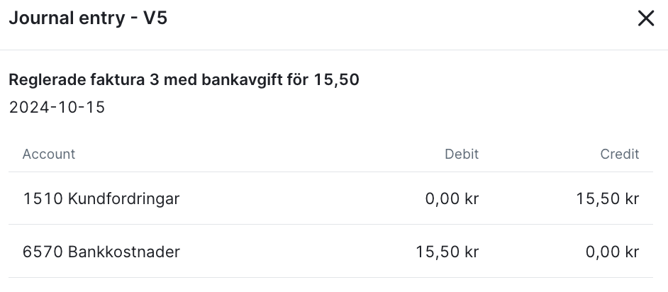 Once the settlement is created, it must be bookkept to adjust the accounts receivable. For bank fees, the system currently uses account 6570 (Bank charges). This can be customized in future implementations.